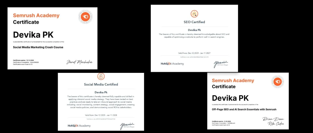 “I am a certified Digital Marketing Specialist based in Thrissur, holding credentials from Semrush and HubSpot. These certifications highlight my expertise in SEO and SMM , demonstrating my ability to drive impactful online strategies.”